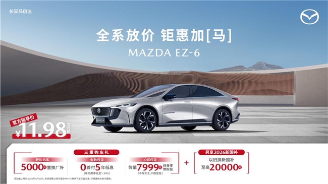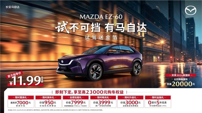 人间四月天,正是全家踏春露营、解锁自驾的黄金时节,一台靠谱的座驾,正是春日旅途最安心的搭档。即日起至2026年4月30日,长安马自达携全系车型奉上真金白银的购车礼遇:MAZDA EZ-60、EZ-6两大全球新能源车型至高可享20,000元以旧换新国补与多重专属权益,MAZDA CX-50行也、次世代MAZDA3昂克赛拉等热门燃油车型同步放出焕新底价,以全球统一的硬核品质与诚意满满的福利政策,陪你奔赴春日的每一场山海,轻松解锁高品质出行生活。