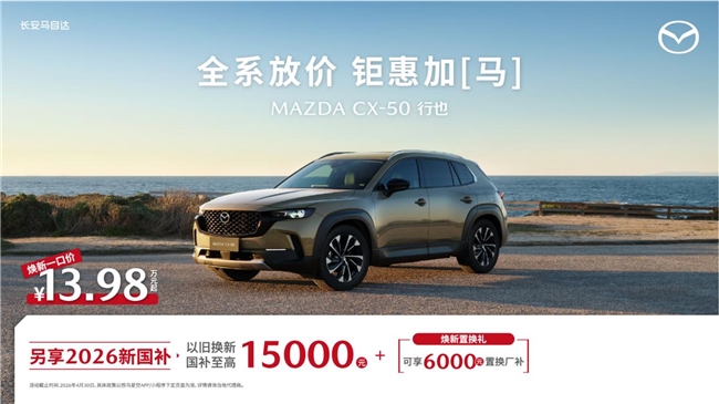 “山系生活宽体SUV”MAZDA CX-50行也(以下称CX-50行也),天生为春日户外生活方式而生,完美契合当代家庭“城市通勤+户外旅行”的多元出行需求。4,785mm越级车长搭配宽体车身设计,带来远超同级的车内空间与后备箱容积,帐篷、天幕、折叠桌椅、山地自行车等春日户外装备都能轻松收纳,全家出行毫无压力;高离地间隙搭配专业级底盘调校,无论是城市铺装路面、乡间非铺装小路,还是山野轻度穿越路况,都能从容应对,带你解锁更多春日小众风景。活动期间,CX-50行也焕新一口价13.98万元起,叠加6,000元置换厂补与至高15,000元以旧换新国补,至高综合补贴可达21,000元,本月购车质价比拉满。