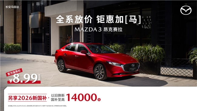 MAZDA3昂克赛拉全系8.99万起,购车可享至高14,000元以旧换新国补,是年轻群体城市通勤、周末短途出游的首选;