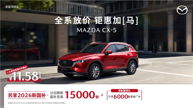 MAZDA CX-5全系限时11.58万起,至高可享15,000元以旧换新国补与6,000元置换厂补,全球超400万用户口碑背书,合资紧凑型SUV品质之选,兼顾家用与自驾;