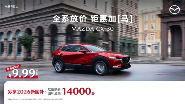 MAZDA CX-30全系9.99万起,叠加至高14,000元以旧换新国补,潮酷造型灵活好开,春日城市穿梭、周边打卡无压力。